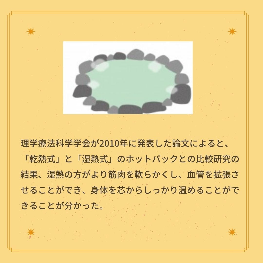 *理学療法科学学会が2010年に発表した論文によると、「乾熱式」と「湿熱式」のホットパックとの比較研究の結果、湿熱の方がより筋肉を軟らかくし、血管を拡張させることができ、身体を芯からしっかり温めることができることが分かった。玄米の中の水分が蒸気となって放熱し、体の奥深くまで行き届き芯からじんわり温まります。