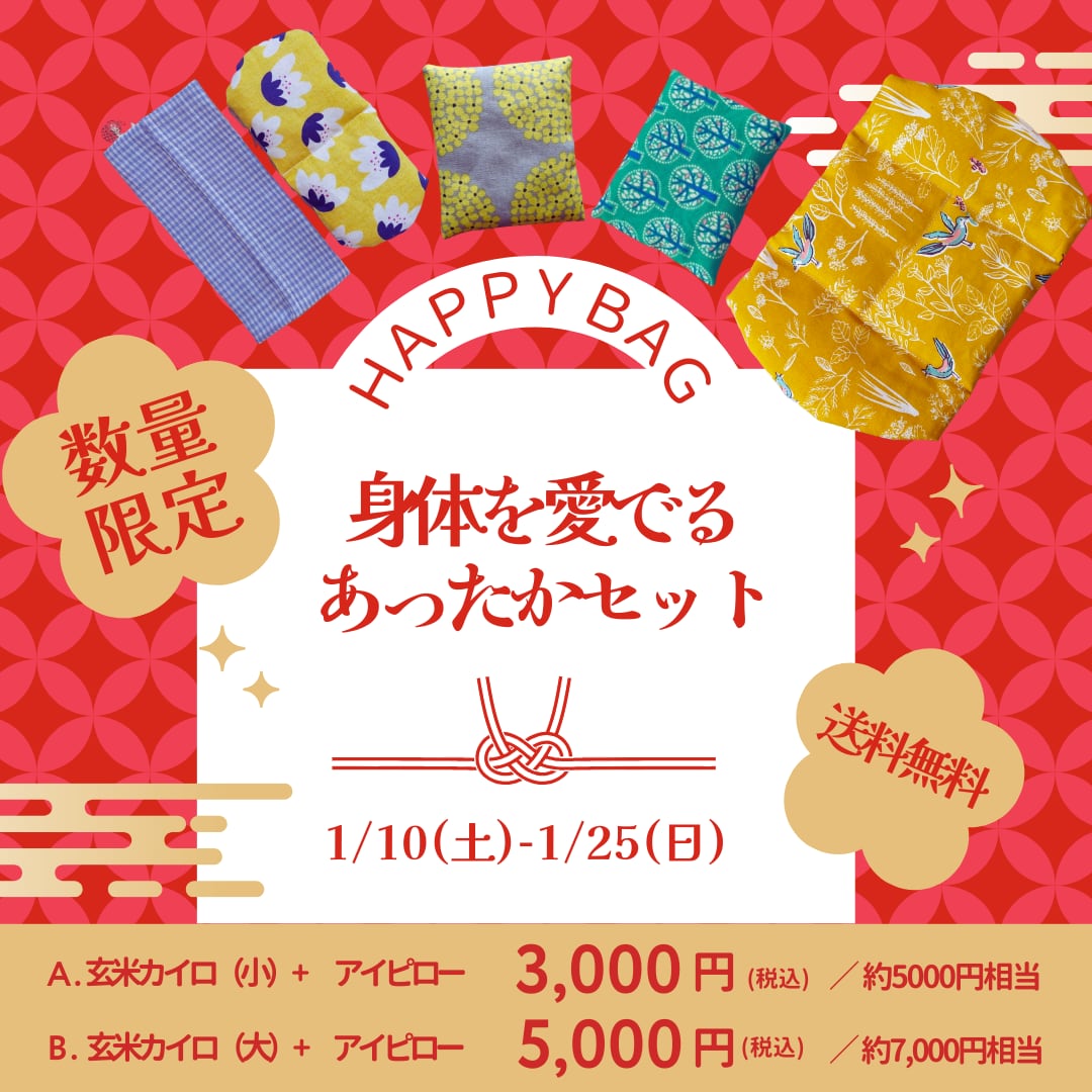 じんわり芯から身体を温める 数百回使えてお得な玄米カイロ、アイピローがセットになった福袋です。