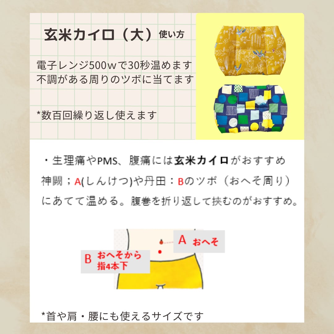 下痢、胃腸の不調、生理痛等 、 おへそ周りのツボに当てて温めると効果的です。