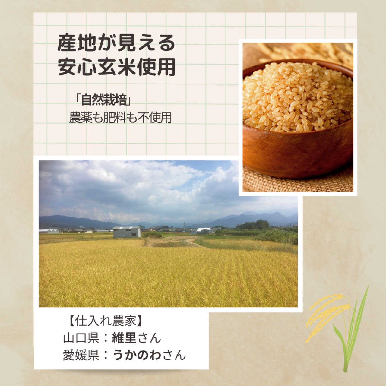 安心安全な自然農法 JAS認定(農薬、化学肥料も不使用)の玄米を契約農家さんから仕入れています。